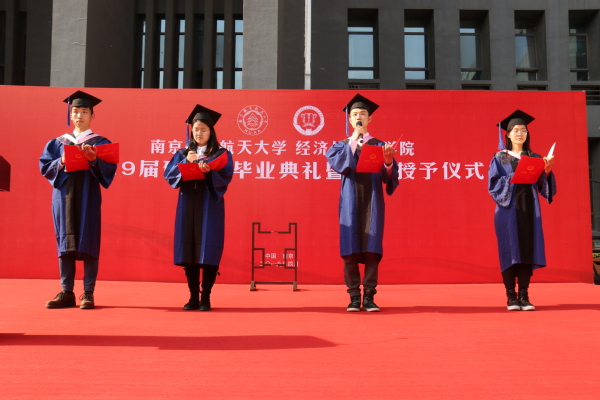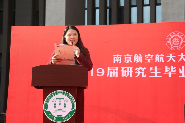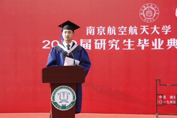 接下来,由王海谊等四名毕业生朗诵了一首由周德群等老师创作的《经管梦》。“强特色,争一流,经管梦,代相传”,在四位同学的朗诵声中,回顾了p站 建院35年来从无到有、由弱变强的发展历程,激发了同学们爱校荣院的感情,最后全体毕业生齐声喊出“我骄傲,我是南航经管人”,将毕业典礼推向了高潮。