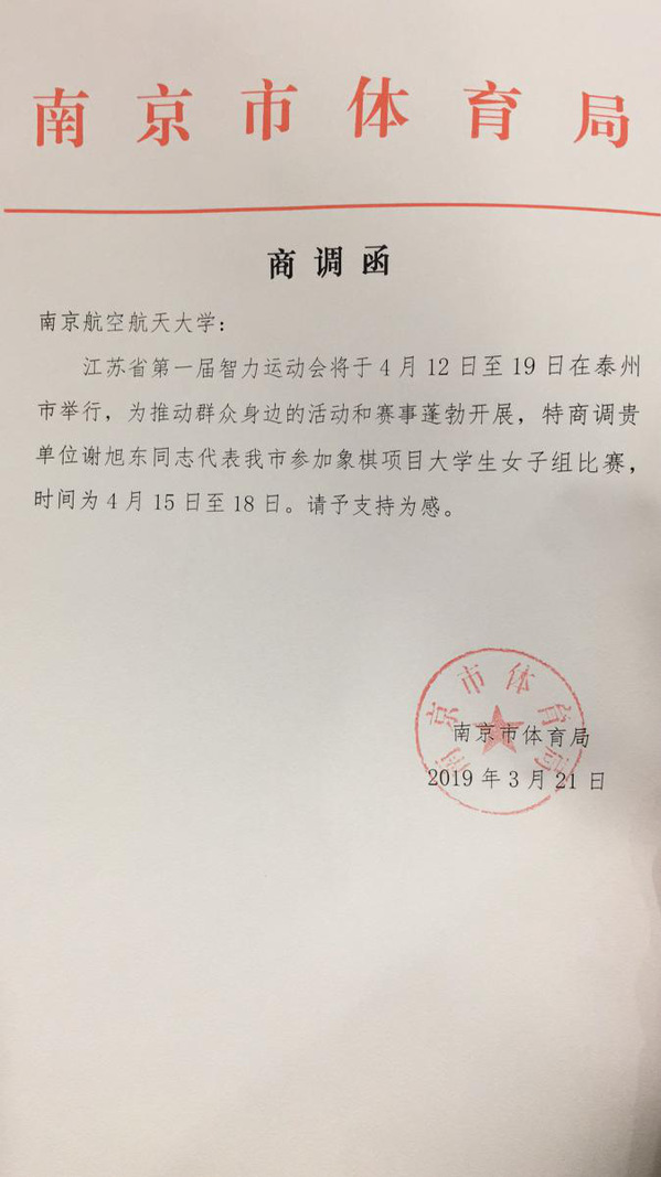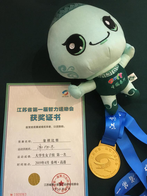 p站 2018级研究生谢旭东同学,经过多轮激烈的角逐,最终问鼎江苏省第一届智力运动会中国象棋大学生女子冠军,为南京市摘得一枚宝贵的金牌。