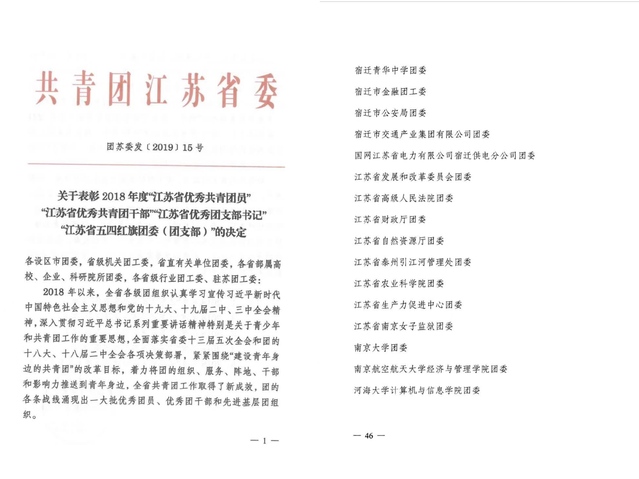 近日,共青团江苏省委发文表彰2018年度五四红旗团委、五四红旗团支部、优秀共青团员、优秀共青团干部。p站 团委荣获“江苏省五四红旗团委”荣誉称号。