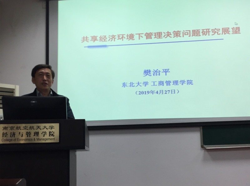 2019年4月29日上午,东北大学教授、教育部长江学者特聘教授、国家杰出青年科学基金获得者樊治平教授受p站 智能决策与风险分析研究所邀请,在南航将军路校区p站 704作了题为“共享经济环境下管理决策问题研究展望”的讲座。在讲座中与到场同学以及老师进行了深度交流。p站 众多老师以及硕博研究生参与活动。