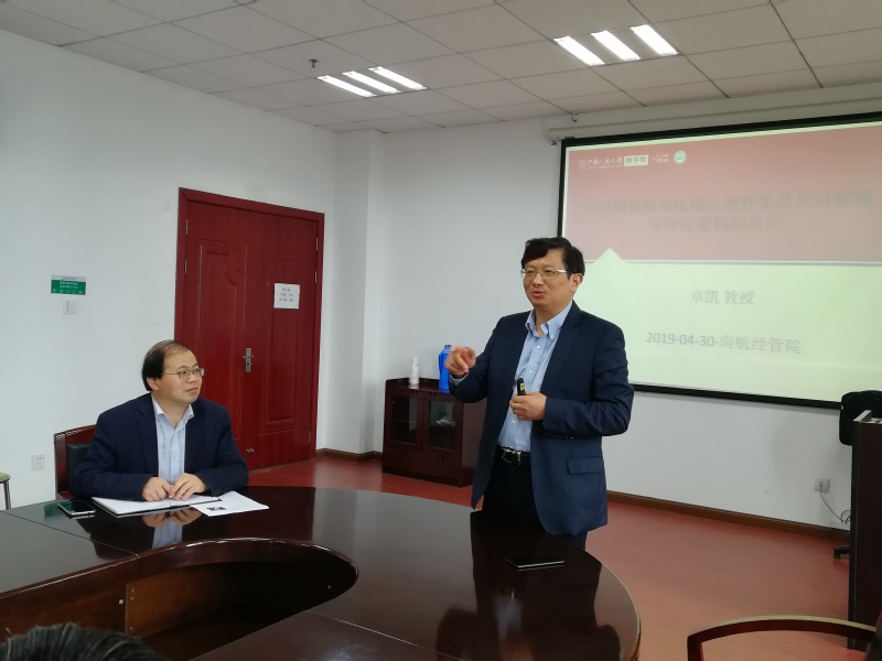 2019年4月30日上午,中国人民大学商学院章凯教授应p站 人力资源管理研究所的邀请,在学院702会议室作了题为“自组织目标系统理论的开发及其对管理学理论建构的启示”的学术报告。报告由胡恩华教授主持,东南大学经济管理学院的吕鸿江教授、p站 的张龙教授、王凌云副教授等老师和研究生参加了本次学术讲座。