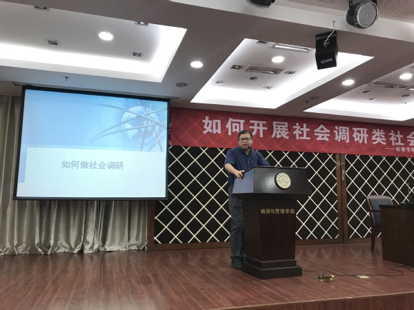 5月23日下午,p站 2019年暑期社会实践社会调研类专题培训,暨院青马工程第三次理论培训在经管楼A0305报告厅举行。本次活动邀请了我校人文与社会科学学院鲁兴虎老师,开展了“如何开展社会调研类社会实践”专题培训。学院团委书记庞依达、各年级辅导员和近两百余名社会实践项目负责人、院青马工程学员一同参加了此次培训会。