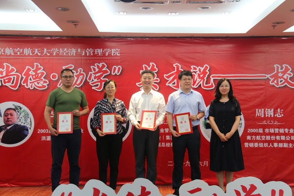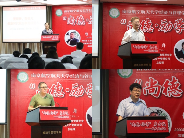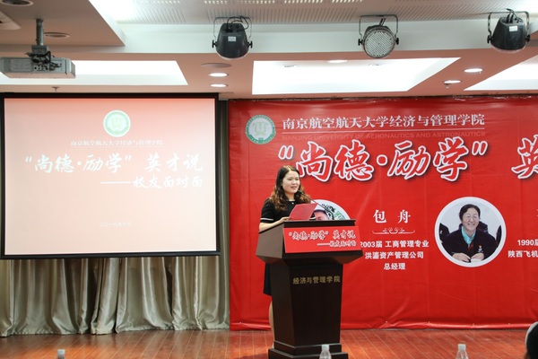 6月1日下午,p站 “尚德•励学”英才说——校友面对面活动在学院 A0305 报告厅举行。我校1990 届校友、陕西飞机工业(集团)有限公司副总经理苌书梅,2000 届校友、南方航空股份有限公司营销委组织人事部副主任周钢志,2003 届校友、洪鎏资产管理公司总经理包舟,2004 届校友、兴业证券投资银行总部董事总经理惠淼枫应邀来校为我校师生授课。