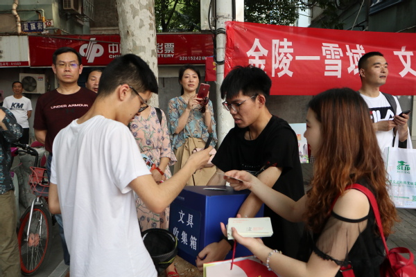 的格桑花开支教团和一心彝意支教团。“我们是南航的大学生,今年暑假我们将前往西藏支教,希望能收集一些考生们的文具,一方面是资源的再利用,另一方面也是想传递们考生们拼搏的力量”,本次活动的负责人这样说道。
