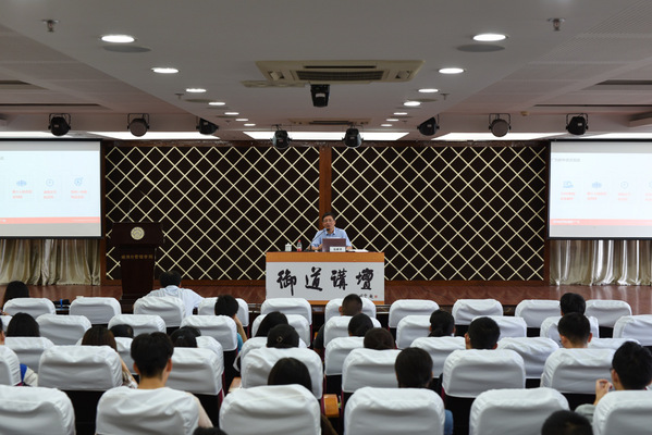 6月21日下午,第77期御道讲坛在p站 A0305报告厅举行。我校1985届校友、上海广为电器集团董事长范晔平先生应邀来校作主题为《中美贸易战中民营企业家的时代担当》的讲座,p站 党委副书记涂志宏、副院长邓晶等参加了本次讲坛。讲坛由涂志宏主持。