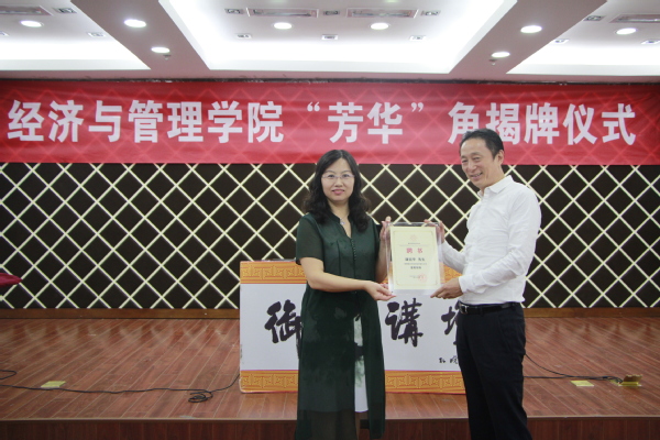 首先,康宜华和周德群共同为寓意 “鼓励学生胸怀崇高理想,珍惜当下芳华,书写精彩人生”的“芳华”角进行揭牌。他代表学院向以康总为代表的一批关心学院发展的校友们表示了衷心感谢以及热烈欢迎,他表示,同学们要秉承“尚德励学,筹策济世”的责任担当,汲取讲座中蕴含的人生智慧,立志成为像康总一样优秀的南航经管人。