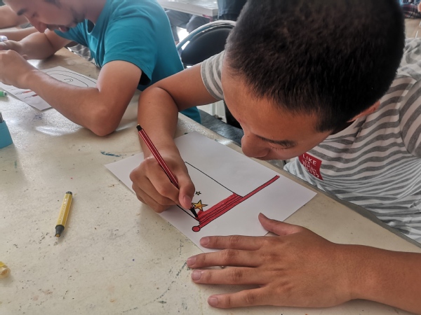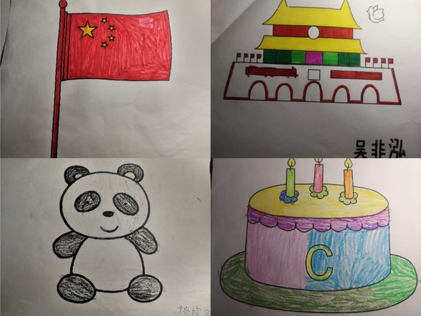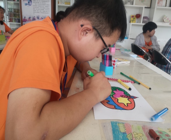 熊猫、国旗、天安门和生日蛋糕,代表着新中国最鲜明的色彩。志愿者也希望通过绘画的方式和学员们一起为祖国母亲七十华诞庆生。学员们收到画纸和画笔后十分兴奋,志愿者不停地给他们鼓励,激发他们的兴趣并让他们保持热情。一笔一划,是他们用自己的方式表达对祖国的热爱;五彩斑斓,是他们在描绘自己心中的世界。虽然宁馨的学员有一定的心智障碍,可是在绘画过程中,他们的热情,他们的执着,他们口中一直念叨着祖国祖国,都反映出他们内心深处对祖国深深的爱。