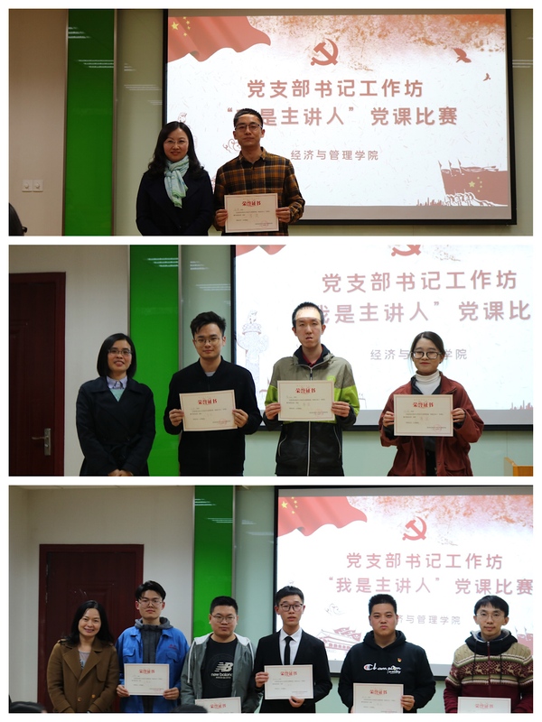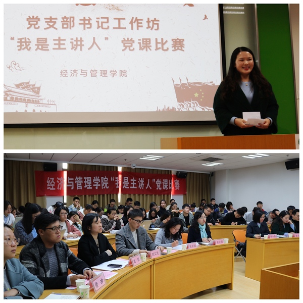 在院楼A0304会议室举办了新一期党支部书记工作坊,活动以“我是主讲人”党课比赛的形式开展,院党委书记焦宏图、组织部副部长庞小燕、校学生处副处长张亚丽、院党委副书记涂志宏、组织员袁颖、管工系教工支部高广鑫、工商系教工支部刘文龙、学生党总支成员以及学生党员代表参加了此次活动。
