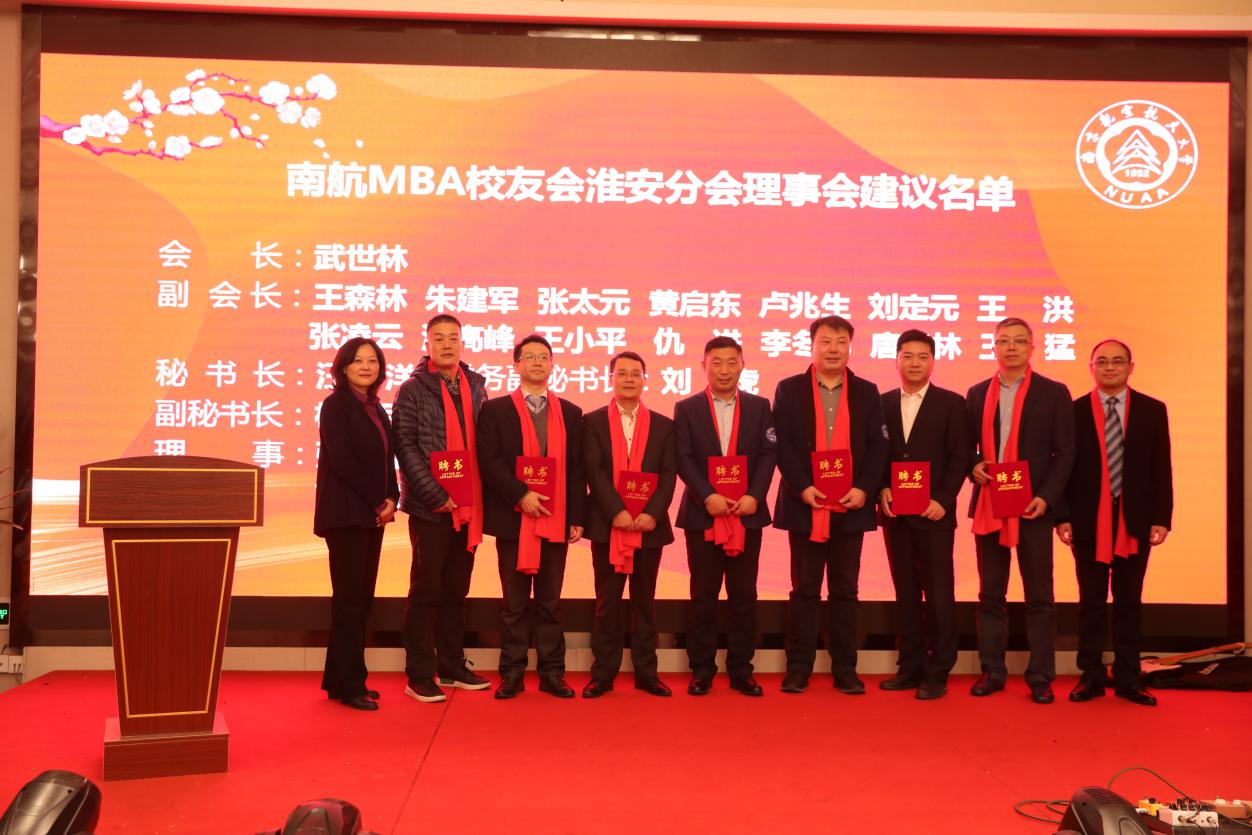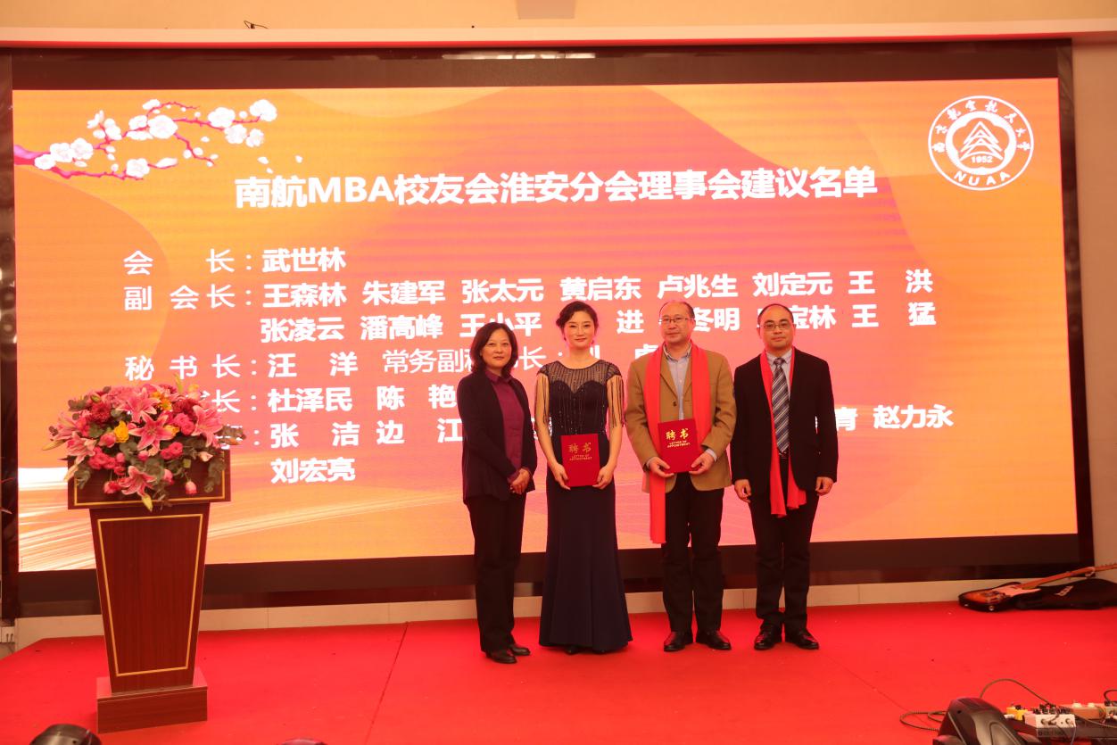 12月28日,p站 MBA校友会淮安分会成立大会在淮安成功召开。淮安市教育局局长张元贵,淮安市人力资源与社会保障局副局长王乃岩,淮安市人才中心主任陈朝晖,淮安市就业管理中心副主任刘兆尚,淮安天士力药业副总经理杨国军,万香科技股份有限公司副总经理陈兆钢,淮安经济开发区热电有限公司常务副总经理张德善,淮安柴米河农业科技股份有限公司王其传,南航党政办/发展联络部副部长、校友总会副秘书长张钟勤,p站 副院长王子龙,党政办/发展联络部校友会办公室主任单晶,MBA教育中心执行主任、南航MBA校友会秘书长杜刚,MBA教育中心学生工作与职业发展办公室主管祝少琪,经管院校友工作秘书许志卓以及淮安各界200多位校友代表欢聚一堂,共同庆祝南航MBA校友会淮安分会的成立。