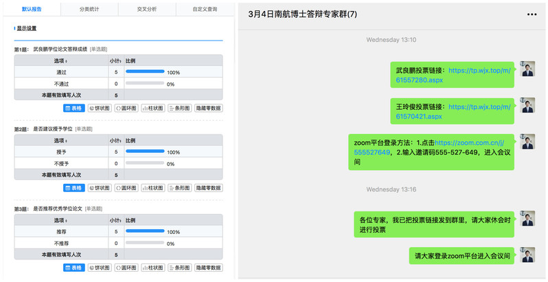 答辩过程中,按照p站 研究生学位论文答辩要求,两位学生通过论文内容陈述展示了研究成果,对答辩委员会成员的提问质询进行一一解答。答辩完成后经过答辩委员的线上讨论、投票表决,一致认为两位博士研究生的研究成果、学位论文和答辩过程达到了博士学位的要求,建议学位委员会授予博士学位。为了确保学位论文线上答辩的公开、真实、完整、使线上答辩有据可循。整个答辩过程,以及后续的匿名表决环节都做了录屏、截屏,作为答辩记录留存。
