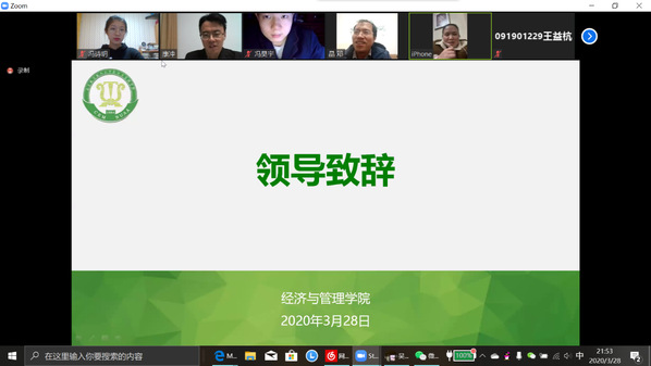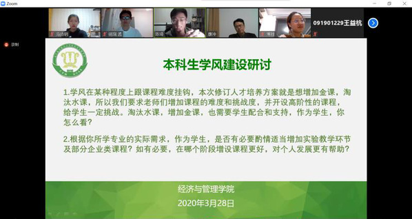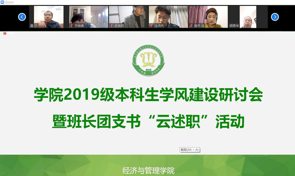 听取大家的发言后,邓晶代表学院对各位班主任、任课教师在疫情特殊时期坚守各自岗位,顺利推进并如期完成了学院部署的各项工作表示了感谢。并指出,各位班级骨干工作思路清晰,工作落实有力,为学院的人才培养、教风学风等各方面工作提供了很多颇具建设性的建议。涂志宏表示,线上教学的形式对班干部提出新要求,疫情防控的任务对班级管理能力提出新挑战。各班级、团支部作为学院的基层组织,要协助辅导员一起坚持做到一手抓疫情防控,一手抓班级学风建设,确保学院各项工作传达到位、解释到位、落实到位,为线上教学和日后的返校开学贡献自己的力量!
