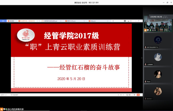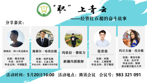 5月20日,p站 举办“‘职’上青云职业素质训练营——经管红石榴的奋斗故事”交流分享会,活动采取线上线下相结合的形式,邀请新疆内派教师玛依拉•赛依力以及16级优秀毕业生针对新疆籍少数民族学生的职业生涯规划进行专题分享, 40余名学生参与本次交流会。
