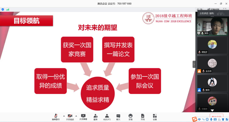 5月23日,p站 2018级卓工班开展了“展望未来,卓越传承”线上悦享会,管理科学与工程系副主任虞先玉、班主任庄品、辅导员许乃元、高年级学生代表以及全体卓工班学生参加了本次悦享会。高年级学生代表结合自身经历以“大学是青春的战场”“卓越工程人才的使命担当”“从科创竞赛说开去”为主题展开经验分享,并结合现阶段学生可能存在的疑惑提出了具有针对性的建议。虞先玉对各位高年级优秀学子蕴含臻于至善、追求卓越的IE精神及其优秀经验表示了肯定,并希望2018级同学们继续瞄准产业需求、扎根学院实际,走多样化发展之路,持续创造新的辉煌。