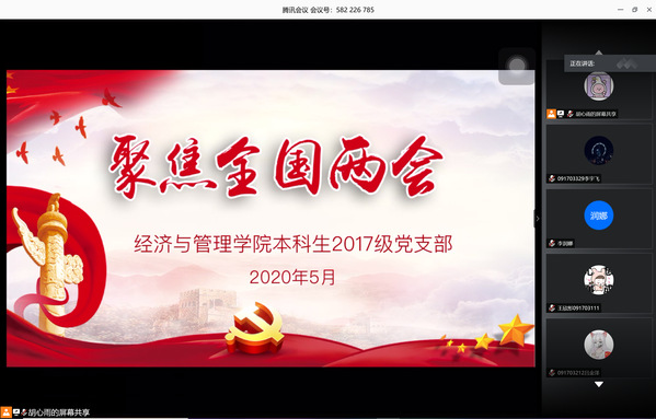 一年一度的全国两会,是我国各项政策的风向标,也是基层群众参与与了解国政时事的重要方式。17级党支部成员在全国各地准时收看本次两会,通过电视和网络直播,置身两会现场,学习政府报告,掀起“乐学、好学、善学”的学习热潮,营造“家事国事天下事,事事关心”的学习氛围。