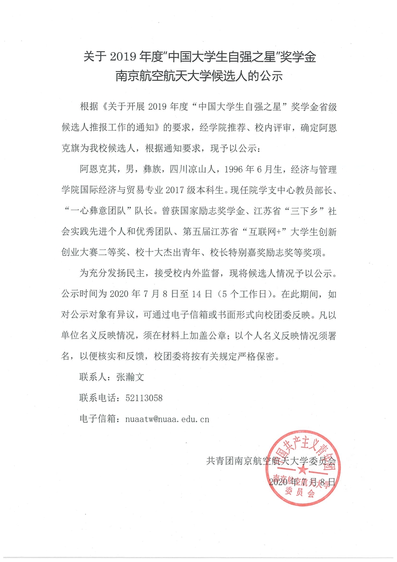 关于2019年度“中国大学生自强之星”奖学金p站 候选人的公示