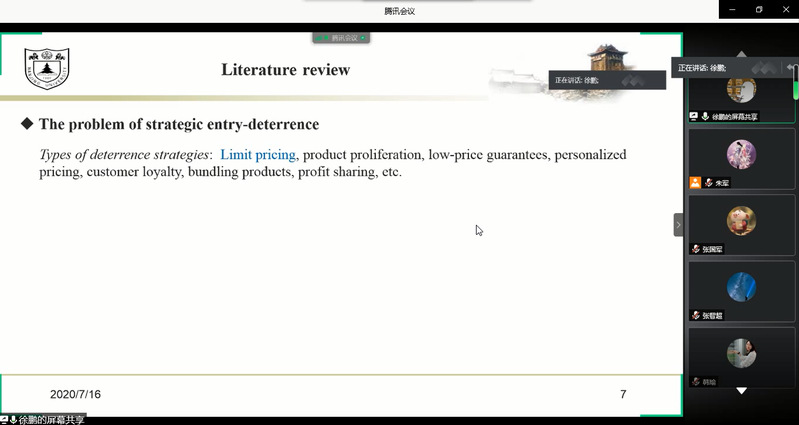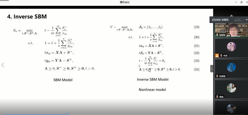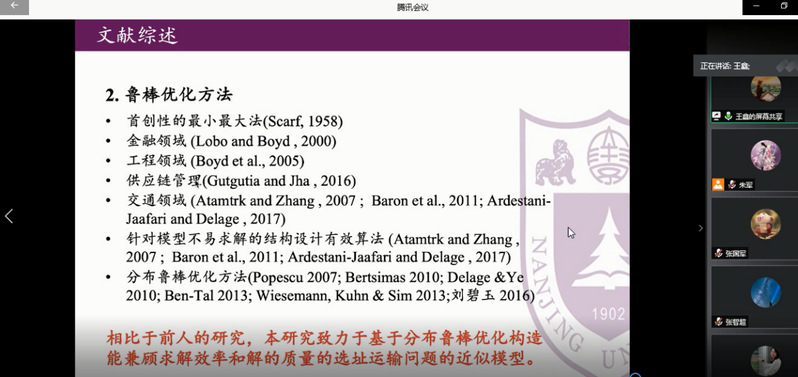 7月16日下午,青年学生张国军、王鑫、徐鹏受学院智能决策与风险分析研究所邀请,在腾讯会议分别作了题为A General Inverse DEA Model for Non-radial DEA、Target-oriented Robust Location-Transportation Problem、Pricing and entry strategies for competitive firms with managerially optimistic entrant的讲座。p站 教授徐海燕、谢乃明、朱建军等教师及部分硕、博研究生线上参加了张国军、王鑫、徐鹏的报告分享,本次学术报告由徐海燕主持。