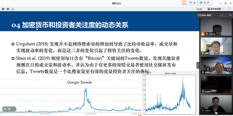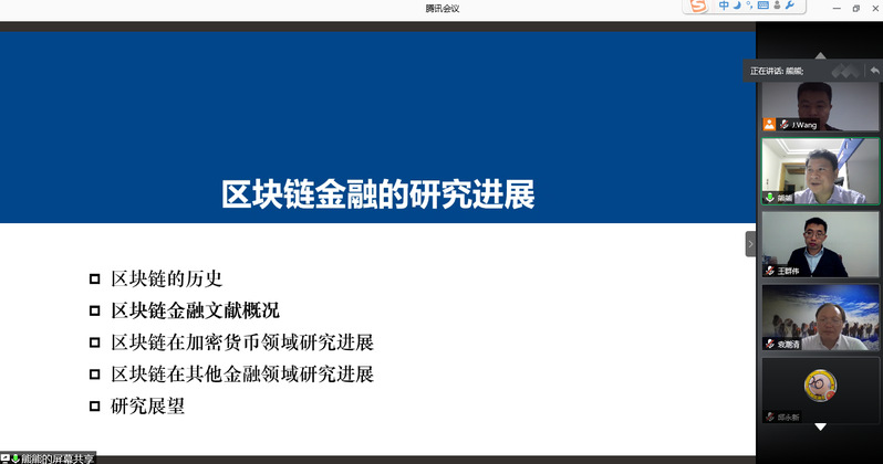 10月12日,天津大学教授熊熊应学院金融研究所邀请,在线为我校师生作了题为“区块链金融研究进展”的精彩学术讲座。本次讲座由金融研究所所长王建立主持。p站 副院长王群伟、教授袁潮清、朱庆缘、副教授桑秀芝、陆珩瑱、讲师苏飞等教师及部分硕、博研究生共一百四十多人参加了本次学术交流。