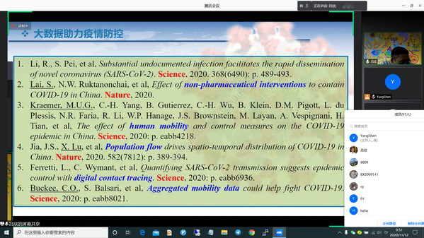 11月12日上午,国防科技大学系统工程学院教授吕欣受p站 信息管理与电子商务研究所邀请,在腾讯会议作了题为“大数据技术在应急管理中的前沿应用”的讲座,p站 部分教师及研究生共约100人线上参加了吕欣的报告分享,本次学术报告由副教授沈洋主持。