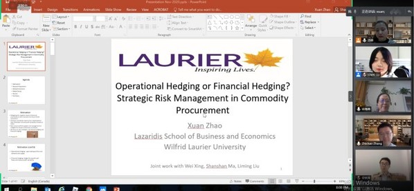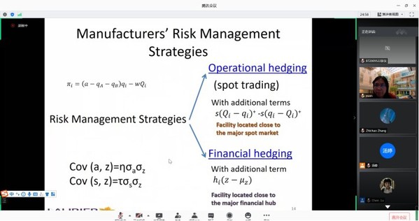11月18日上午,加拿大威尔弗里德·劳里尔大学教授Xuan Zhao受学院智能决策与风险分析研究所邀请,在腾讯会议作了题为“Operational Hedging or Financial Hedging? Strategic Risk Management in Commodity Procurement”的讲座。p站 教授徐海燕等教师及部分硕、博研究生线上参加了Xuan Zhao的报告分享,本次学术报告由徐海燕主持。
