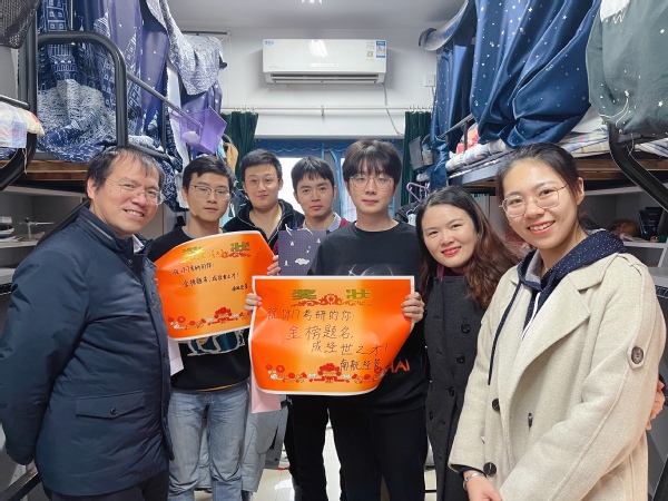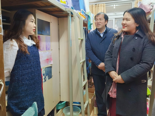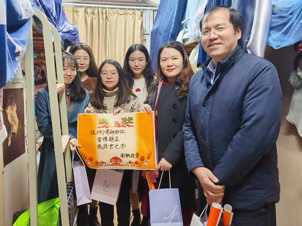 12月8日上午,p站 党委副书记涂志宏、副院长邓晶、2017级本科生辅导员胡心雨、朱一豪共同到宿舍看望考研学生,为各位学子带去一份温暖、增添一份动力。