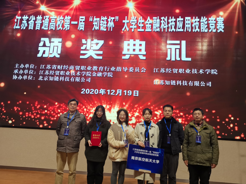 2020年12月19日,江苏省普通高校第一届“知链杯”大学生金融科技应用技能竞赛在江苏经贸职业技术学院举办,本次竞赛由江苏省高等教育学会认定,江苏省教育厅委托江苏省财经商贸职业教育行业指导委员会主办,南航、河海、南农等省内50余院校60团队300师生参赛。通过激烈地角逐,p站 代表队获得了本次大赛的本科组团体一等奖。