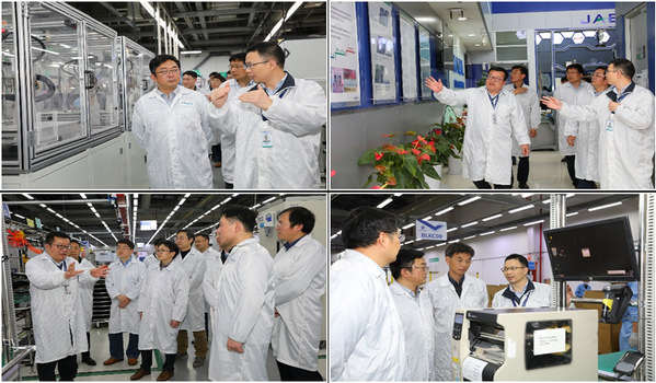 在舒鹏总裁的带领下,周德群、唐敦兵、王澄、王学用等人一同参观了捷普电子(无锡)有限公司的智能化生产线、工厂信息控制中心、和p站角。捷普电子(无锡)有限公司总裁舒鹏详细介绍了企业在信息化、智能化生产线和p站建设等方面的最新进展。