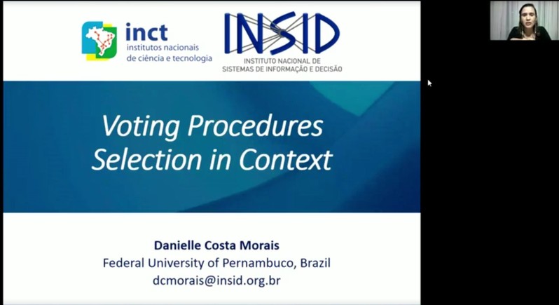 4月13日上午,巴西伯南布哥联邦大学教授Danielle Costa Morais受学院智能决策与风险分析研究所邀请,在腾讯会议作了题为“Voting Procedures Selection in Context”的学术报告。p站 教授徐海燕等教师及部分硕、博研究生线上参加了Danielle Costa Morais的报告分享,本次学术报告由徐海燕主持。