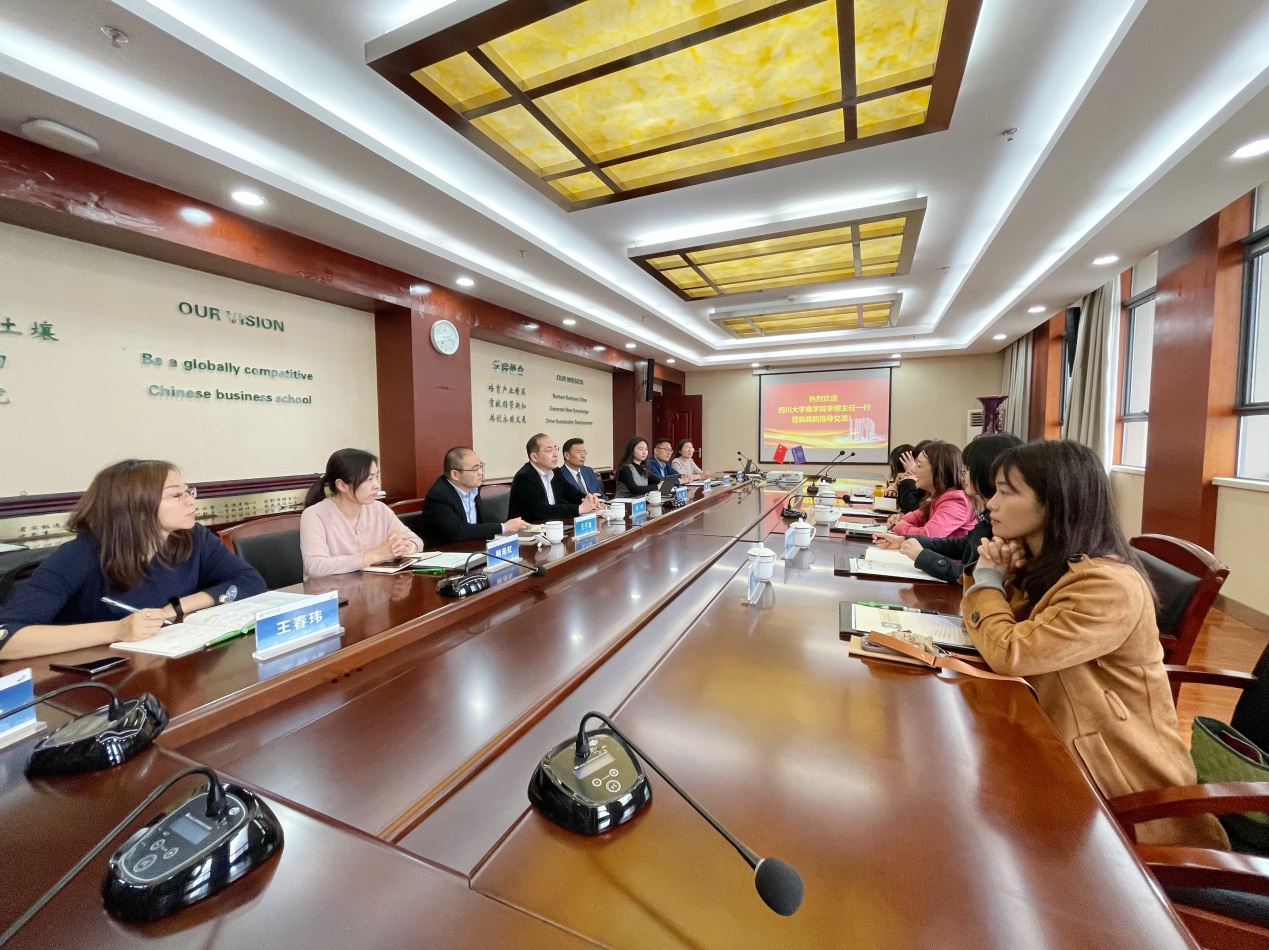 4月16日下午,四川大学商学院MBA教育中心主任李珊、招生品牌高级主管苟芳、品牌主管胡美怡、教务主管张倩、学生事务主管马力澜一行来p站 调研。院党委书记苏州、副院长王子龙、教育培训中心执行主任杜刚以及中心所有老师陪同调研并座谈。