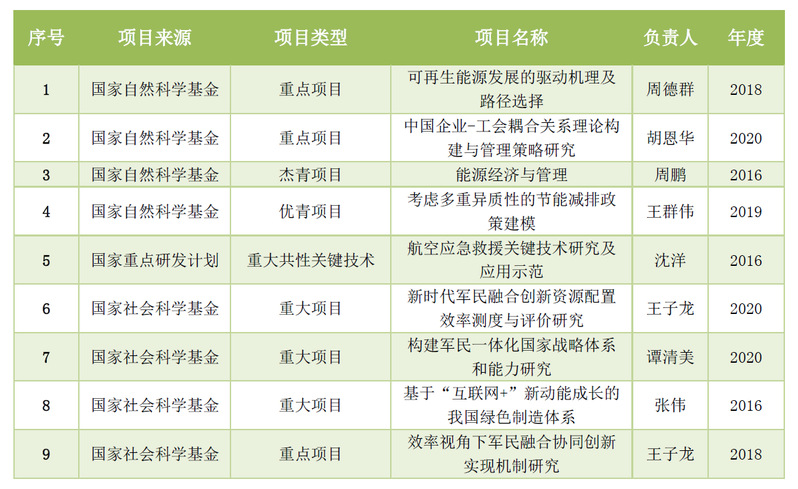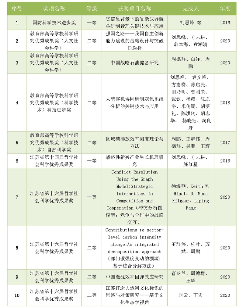 “十三五”期间,学院科研成果质量与学术影响力不断提升,科研方向的发展坚持“三条主线、多维并举”。灰色系统方向“致力原创,持续创新”;能源环境系统建模、冲突分析与决策等方向“聚焦前沿,构筑高地”;复杂装备研制管理、质量与可靠性控制等方向“面向需求,突破瓶颈”。国防经济、人力资源管理、智能制造与供应链优化等多个科研方向在项目资助与成果发表中都取得可喜成绩。
