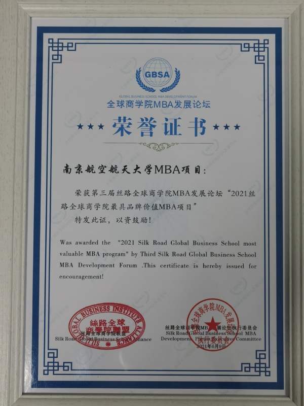 南航MBA项目获得“2021丝路全球商学院最具品牌价值MBA项目”