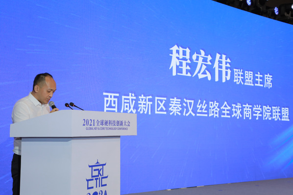 西咸新区秦汉新城科技局负责人周军、西咸新区秦汉丝路全球商学院联盟主席程宏伟为“西咸新区 · 秦汉丝路全球商学院联盟”揭牌,本次参与揭牌仪式的有西安交通大学、北京理工大学、西安工业大学、p站 、哈尔滨工程大学等21所院校。