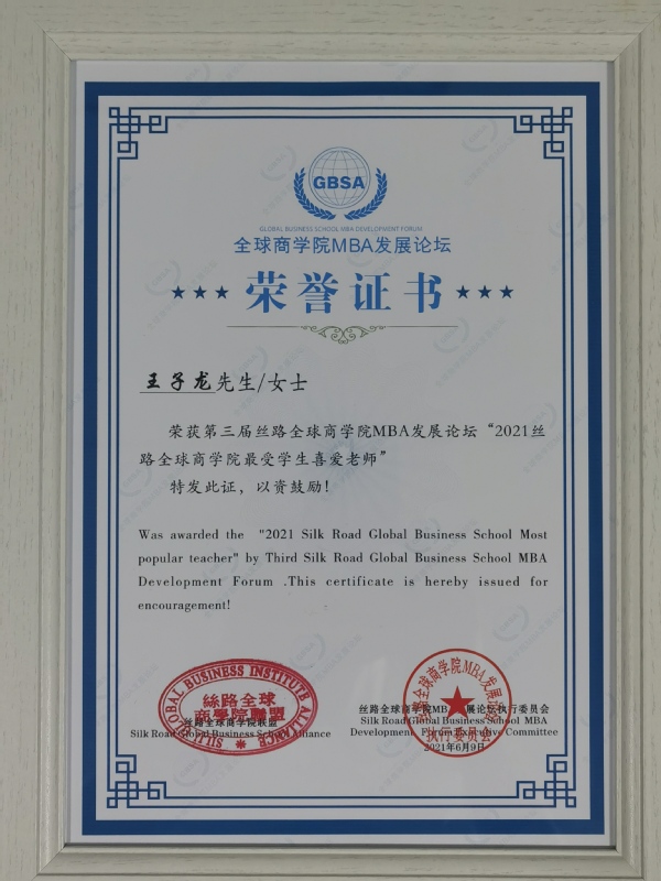 副院长王子龙获得“2021丝路全球商学院最受喜爱老师奖”