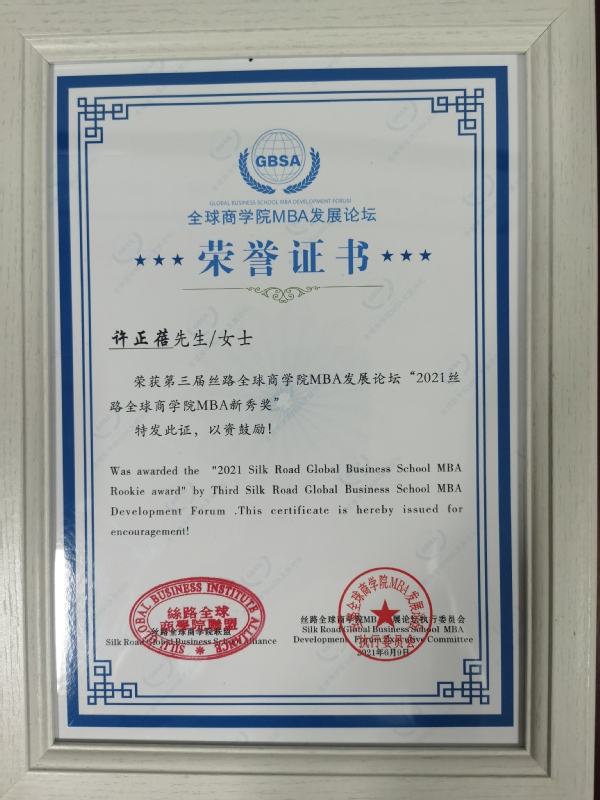 学员许正蓓获得“2021丝路全球商学院MBA新秀奖”