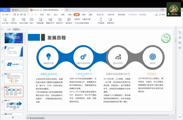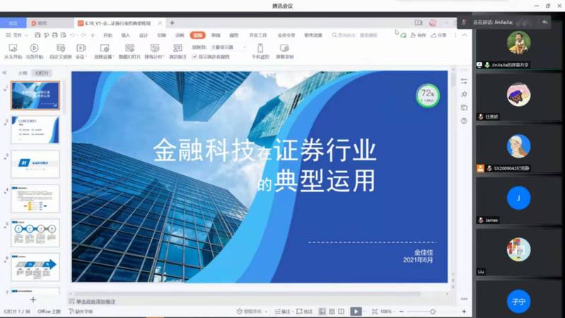 6月16日晚上,华创证券产业金融部执行总经理金佳佳应p站 信息管理与电子商务研究所的邀请,通过腾讯会议作了“证券行业的金融科技问题分析”报告,p站 教授米传民以及诸多学生聆听了此次报告,本次报告由米传民主持。