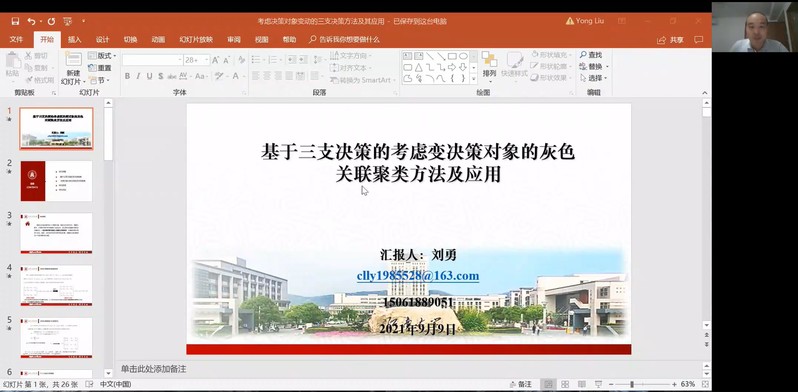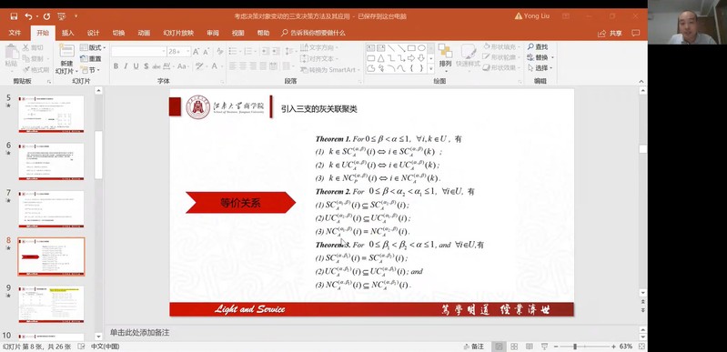 9月9日晚上,江南大学副教授刘勇受学院智能决策与风险分析研究所邀请,在腾讯会议作题为“考虑决策对象变动的三支决策方法及其应用”的讲座。p站 教授徐海燕等教师及部分硕、博研究生线上参加了刘勇的报告分享,本次学术报告由徐海燕主持。