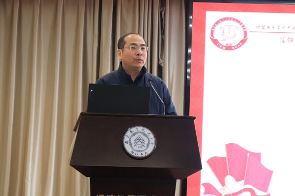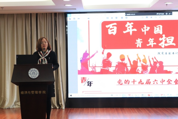 接下来,胡苹为大家讲授了“百年中国,青年担当”主题党课。她从四个时期的庄严宣告讲起,展现了不同历史时期中的青年担当。青年们慷慨激昂的语录、坚定革命的热忱让大家感悟良久。接着,胡书记又为同学们讲述了南航的红色基因、蓝色梦想,以及一代代南航人投身国防建设的先进事迹,总结出了把握大势、把准方向、践行真知的新时代青年选择。