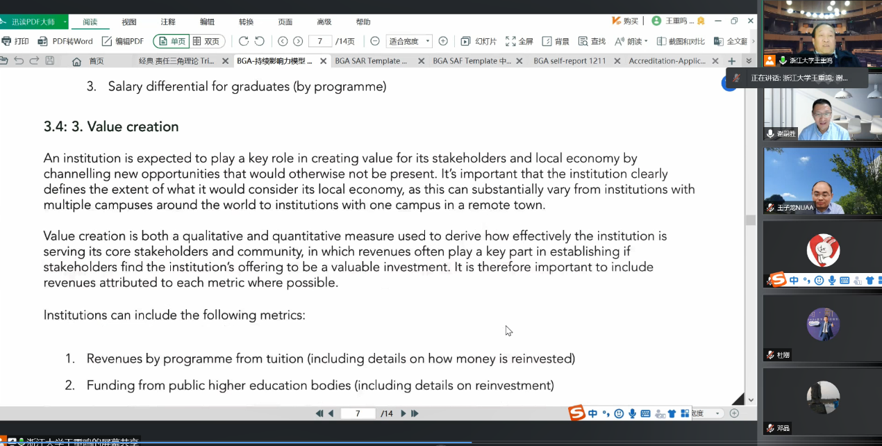 12月21日晚,国际工商管理认证协会(AMBA)中国区总负责人、浙江大学文科资深教授、浙江大学全球创业研究中心主任王重鸣教授应邀指导p站 BGA认证工作。因疫情防控需要,本次会议在线上召开。p站 院长周德群、党委书记苏州、学院副院长王子龙、邓晶、谢乃明、院长助理兼认证中心主任谢嗣胜、MBA教育中心执行主任杜刚以及相关专业老师参加会议。