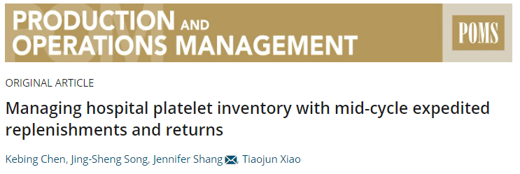 近期,p站 陈克兵教授作为第一作者的研究成果《Managing hospital platelet inventory with mid-cycle expedited replenishments and returns》在UTD24国际顶级期刊《Production and Operations Management》在线发表,实现了p站 教师在该类国际顶级期刊成果发表的突破。研究成果由p站 陈克兵教授、美国杜克大学商学院Jing-Sheng Song教授、美国匹兹堡大学Katz商学院Jennifer Shang教授、南京大学工程管理学院肖条军教授合作完成。