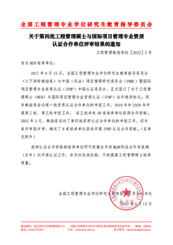 2017年9月15日,全国工程管理专业学位研究生教育指导委员会(以下简称教指委)与中国(双法)项目管理研究委员会(PMRC)暨国际项目管理专业资质认证(IPMP)中国认证委员会,正式签订了关于工程管理硕士(MEM)与国际项目管理专业资质认证(IPMP)合作框架协议。同年教指委启动第一批资质认证合作单位的申报工作,2018年和2020年开展第二批、第三批申报工作,前三批共有48家培养单位获得合作资格。2022年3月,教指委启动了第四批资质认证合作单位的申报工作,经专家评审组评审,确定了p站 成为第四批工程管理硕士与国际项目经理资质认证(IPMP)培养合作单位。