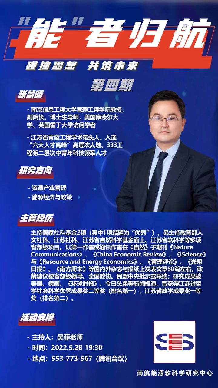 “能者归航”是能源软科学研究中心于2021年10月倾力打造的一个品牌活动。“能者”代表能源软科学研究中心的学子;“归航”意为回到南航。“能者归航”意在搭建一个能源软科学研究中心在校生与毕业生深入交流的平台,进而助力团队形成传帮带、从游共进的良好氛围。迄今为止,“能者归航”已成功举办四期,前三期分别邀请了英国约克大学环境与地理系助理教授周迅、中国社会科学院数量经济与技术经济研究所研究员潘晨、中国航空无线电子研究所物流中心主任姜志平,以及中国航空综合技术研究所工程师徐云天。