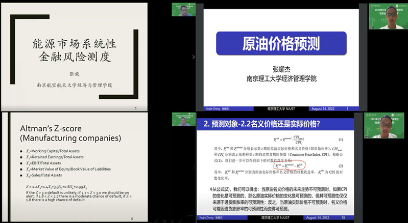 8月14日,p站 张旋副教授围绕“能源市场系统性金融风险测度”主题进行授课,分别从单个公司信用风险测度、联合违约风险测度和系统性风险测度三个维度,结合教学案例和经典论文,介绍了不同的风险测度模型及其相应的应用场景。南京理工大学p站 张耀杰副教授围绕“原油价格的预测”主题进行授课,分别从政府监管、企业管理和金融投资三个视角出发,基于经典原油价格预测模型和方法,分析了原油价格的预测对象、预测变量以及油价的影响因素,解读了原油价格预测的现实意义。