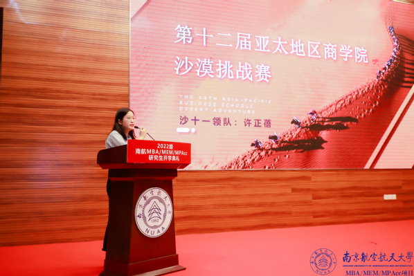 第九届、第十届亚太地区商学院沙漠挑战赛纪录片的现场播放,点燃了整个报告厅,第十一届亚太地区商学院沙漠挑战赛南航智行队领队许正蓓为所有新生分享了亚沙的魅力、亚沙赛的比赛规则和南航亚沙智行团队在各届亚沙赛中所取得的成绩,欢迎所有新生了解亚沙、加入亚沙,奋战沙十二!