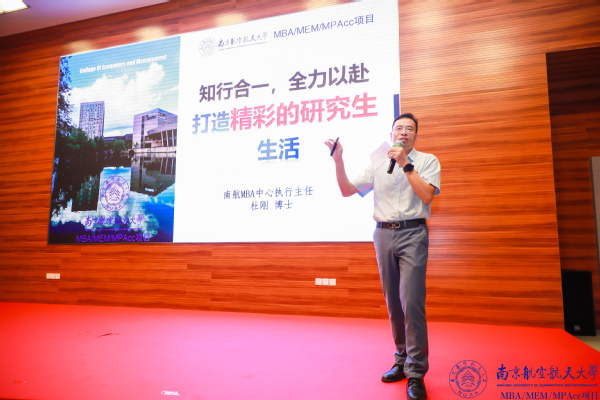 MBA教育中心执行主任杜刚博士为所有新生分享了《全力以赴,知行合一,打造精彩的研究生生活》,他认为拼搏精神尤其重要,与改变世界比较起来,改变自己才容易一些。期待所有新生不断奋进,不断努力,在南航在职研究生的舞台上绽放自我,不断前行。