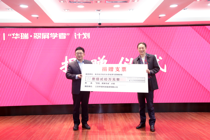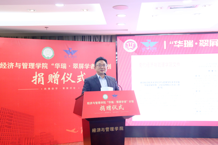 A0305报告厅举行。江苏华瑞时尚集团创始人康宜华校友,华瑞集团财务部、人力资源部相关负责人,校党委副书记、纪委书记杭育新,人事处处长/高级人才办主任崔海涛,学院领导班子成员,院长助理,各系系务委员会成员,各研究所所长,入选校“长空学者”计划人才,校首批百强团队成员,青年教师代表以及博士生代表参加仪式。捐赠仪式由学院党委书记苏州主持。