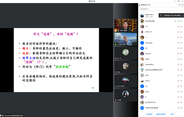 此外,周南告诫大家,聪明是在平淡中坚持的结果。在研究生的培养过程中,处于不同阶段的同学会有挫折感,这是是常态,老师需要积极敏锐地发现学生的点滴思想火花,用诙谐幽默的态度化解学生的沮丧、自责、苦恼、困惑,让学生遇到困难而绝不放弃,在学术与生活中永不失信心。