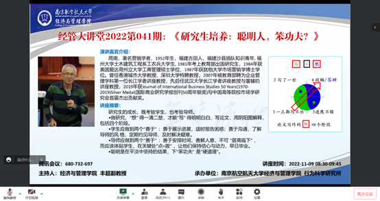 11月9日上午,CJ学者周南教授做客p站 “经管大讲堂”(2022第041期)分享《研究生培养:聪明人?笨功夫?》的主题讲座。本次讲座由院长周德群教授致辞,副教授丰超主持,p站 一百多名师生线上线下同步聆听,此外,还吸引了部分外校老师前来聆听。
