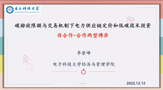 12月12日下午,长江学者特聘教授、电子科技大学p站 李登峰教授受学院智能决策与风险分析研究所邀请,在腾讯会议作题为“碳排放限额与交易机制下电力供应链定价和低碳技术投资非合作-合作两型博弈”的学术讲座。p站 教授徐海燕、副教授高广鑫等教师及部分硕、博研究生线上参加了李教授的报告分享,本次学术报告由徐海燕主持。