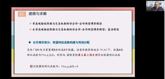 在本次学术讲座中,李登峰首先提出了碳排放限额背景下,一个电力发电厂和一个电力零售商组成的电力供应链的问题模型,然后介绍了发电厂电力批发价格与电力零售商销售价格的竞争、电力发电厂低碳技术投资水平与电力零售商低碳技术投资成本分摊、利润分享的合作及竞争行为。接下来,着重介绍了考虑碳排放限额与交易机制的非合作-合作两型博弈模型的建立与求解过程。最后基于所提出的博弈模型,探讨了碳排放限额与交易机制下电力供应链的价值共创及碳减排策略的优化路径。