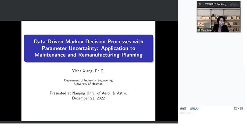 12月21日上午,休斯敦大学向一莎副教授受学院灰色系统研究所邀请,在腾讯会议作题为“数据驱动的带有参数不确定性的马尔科夫决策过程及其在运维和再制造计划中的应用”的学术讲座。p站 教授刘思峰、谢乃明、米传民、副教授胡明礼、欧阳林寒、王俊杰等教师及部分硕、博研究生线上参加了向教授的报告分享,本次学术报告由谢乃明主持。