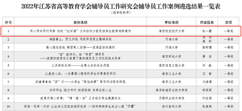 近日,江苏省高等教育学会辅导员工作研究委员会公布了2022年度辅导员工作案例遴选结果,p站 辅导员朱一豪撰写的《同心同向同行同享 依托“红石榴”工作坊的少数民族学生教育培养案例》荣获江苏省辅导员工作案例评选一等奖。